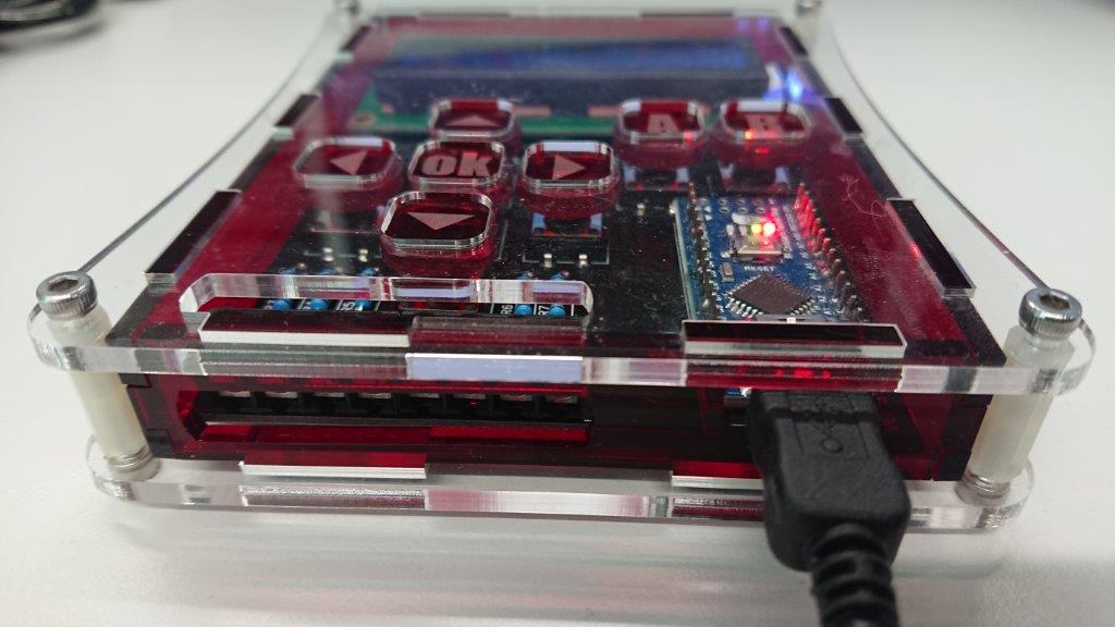 Deshalb habe ich mir eine Rapid Prototyping Plattform gebaut, mit Standard Sachen, die man so braucht. Ein LCD Display, Taster, Ein- und Ausgänge per Schraubklemme und natürlich die serielle Schnittstelle über USB.
